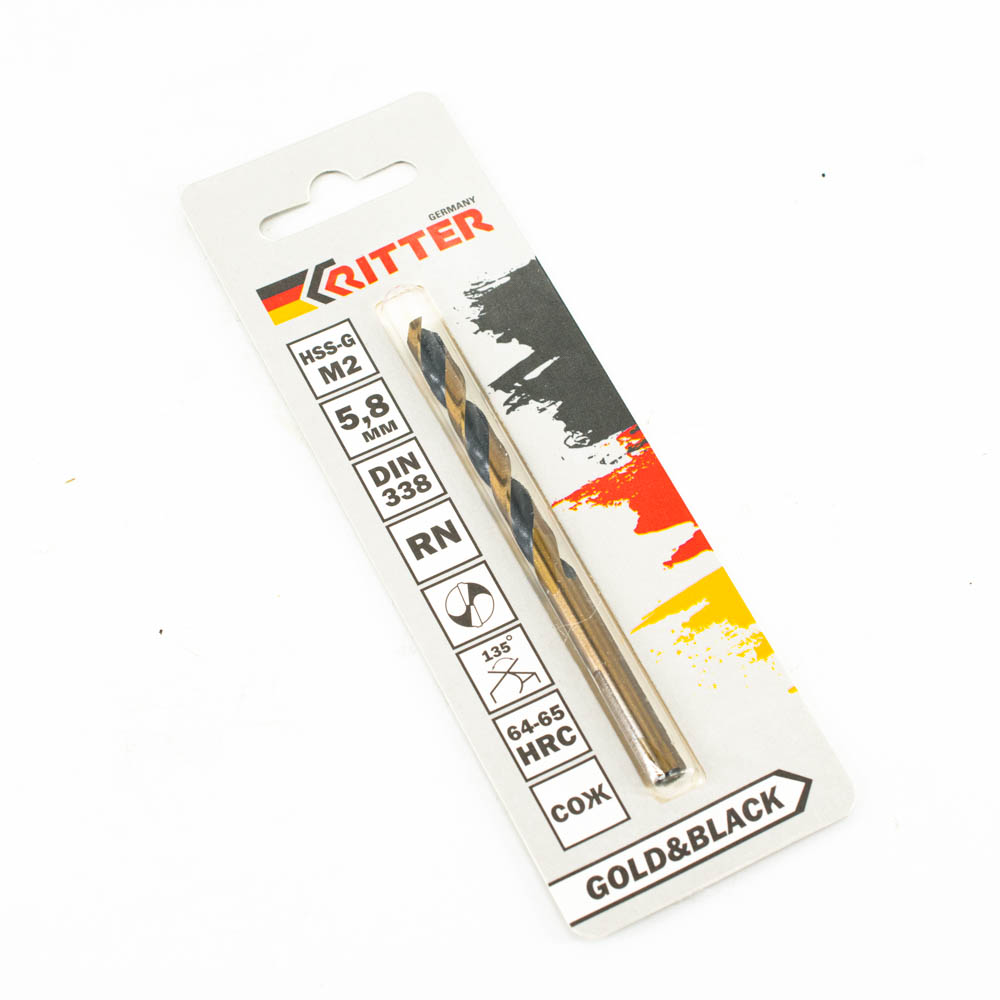 Сверло по металлу Ritter EC 5,8 мм (HSS-G M2 Gold&Black) DIN 338 RN (1 шт в блистере) (1000/250/1)