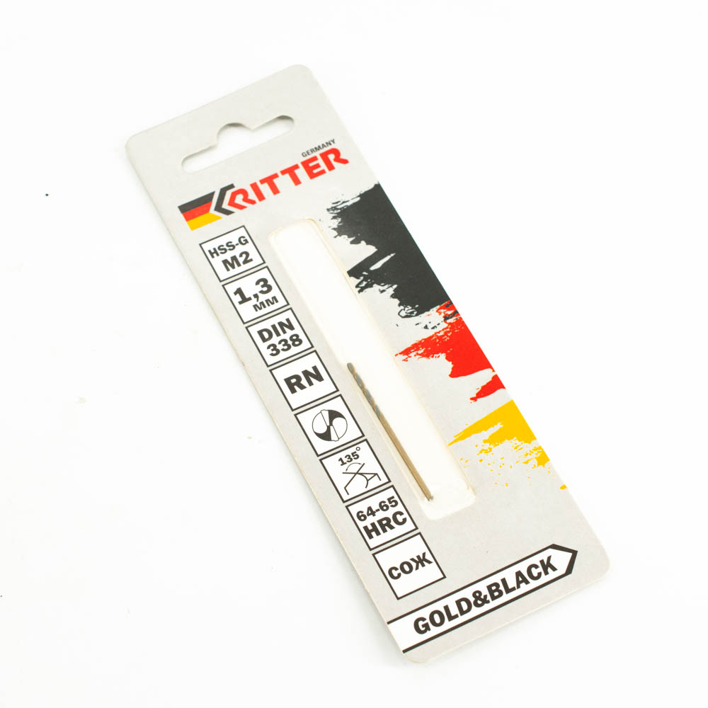 Сверло по металлу Ritter EC 1,3 мм (HSS-G M2 Gold&Black) DIN 338 RN (1 шт в блистере) (1000/250/1)