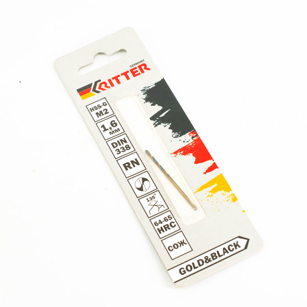 Сверло по металлу Ritter EC 1,6 мм (HSS-G M2 Gold&Black) DIN 338 RN (1 шт в блистере) (1000/250/1)