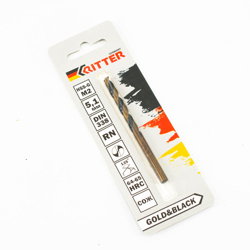 Сверло по металлу Ritter EC 5,1 мм (HSS-G M2 Gold&Black) DIN 338 RN (1 шт в блистере) (1000/250/1)
