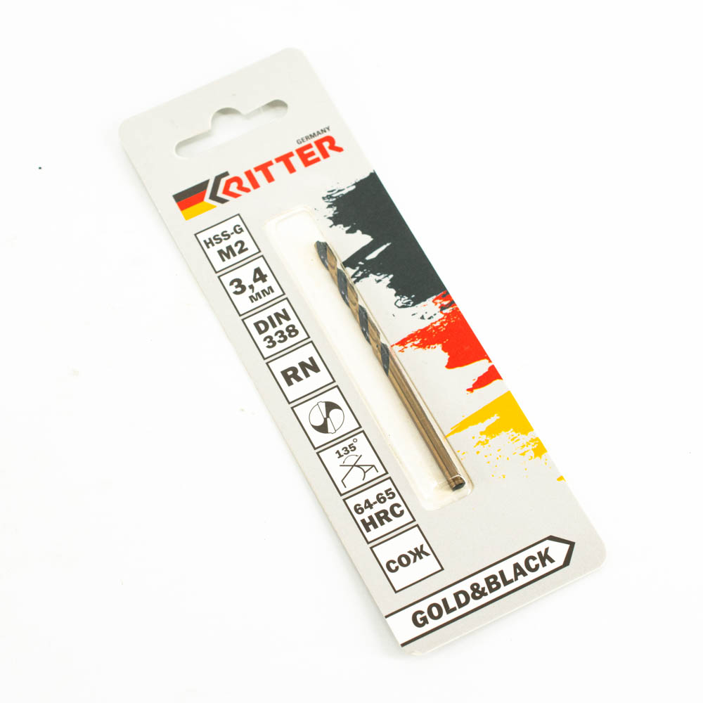 Сверло по металлу Ritter EC 3,4 мм (HSS-G M2 Gold&Black) DIN 338 RN (1 шт в блистере)