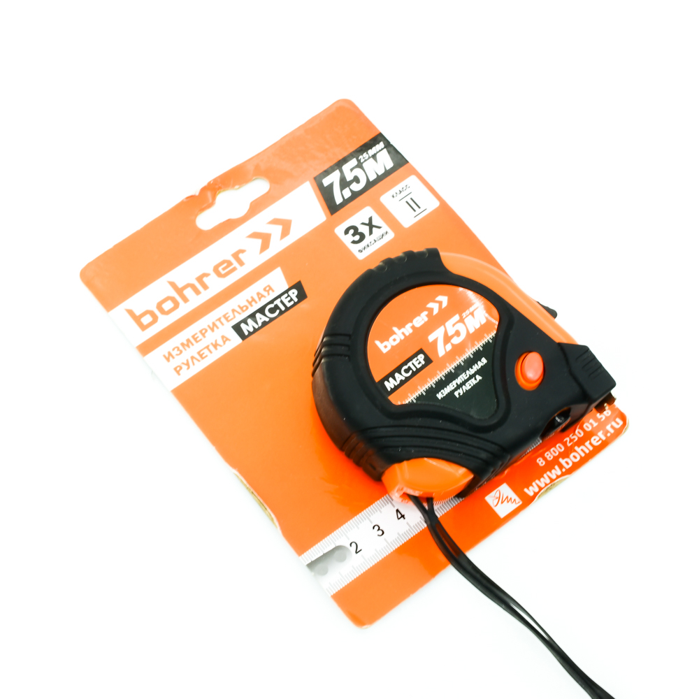 Рулетка Bohrer измерительная Мастер 7,5м х 25мм, 3 фиксации (с боковым фиксатором), обрезиненный ударопрочный корпус