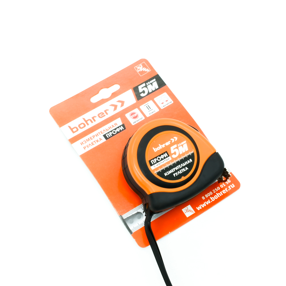 Рулетка Bohrer измерительная Профи 7,5м х 25мм, автостоп, магнитный зацеп, обрезиненный ударопрочный корпус