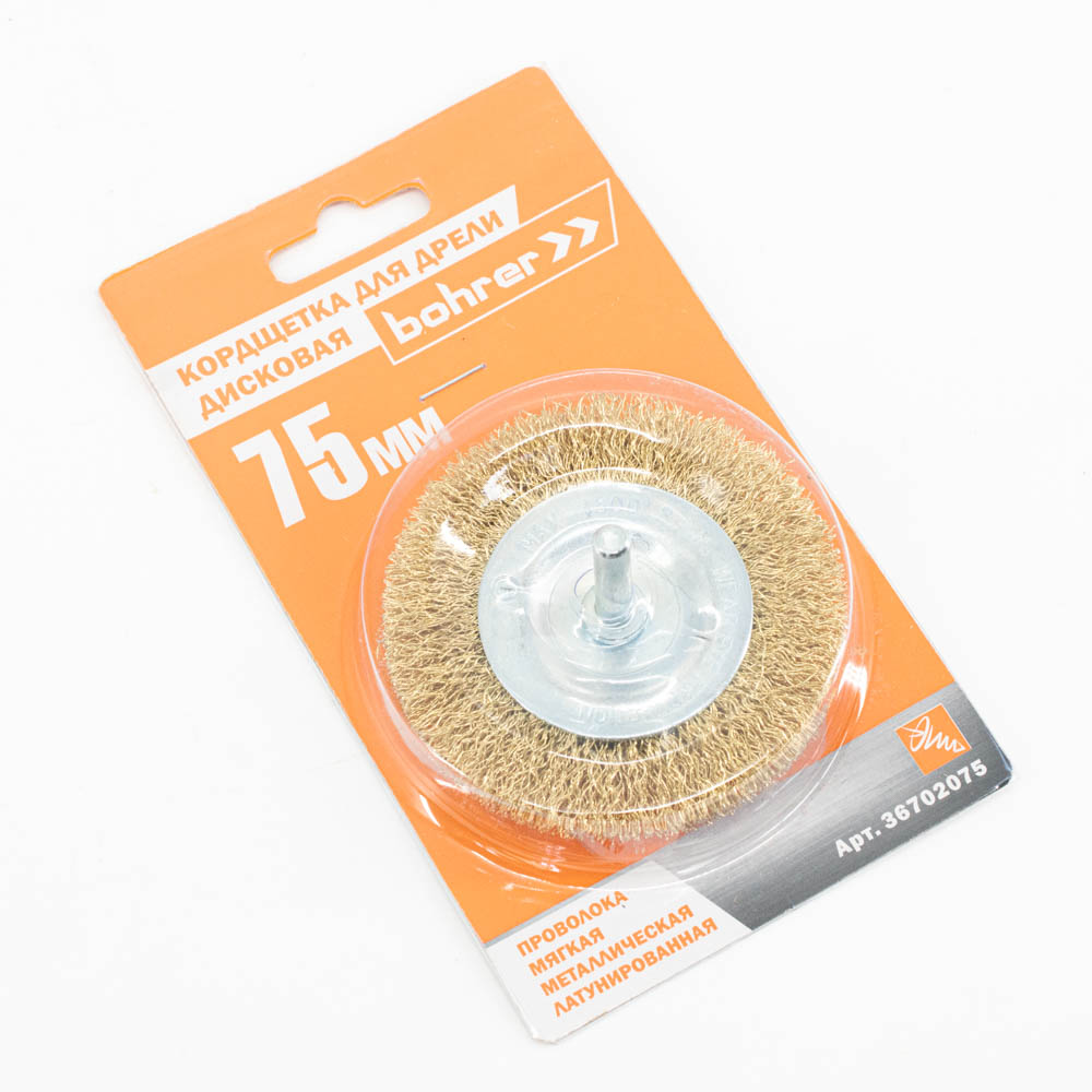 Кордщетка Bohrer дисковая "Колесо" латунированная мягкая 75 мм (толщ. проволоки 0,3 мм) для дрели (в блистере) (120/10/1)