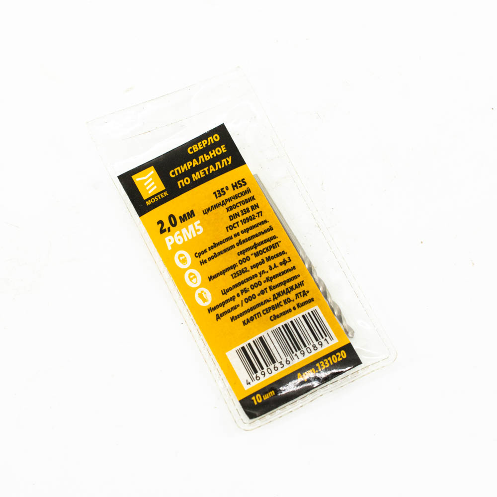 Сверло MosTek по металлу 2,0 мм ц/х HSS (Р6М5) (Упаковка 10 штук)
