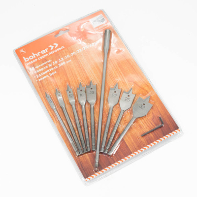 Набор сверл Bohrer перовых по дереву 8/10/12/16/20/22/25/32 х 152 мм + удлинитель (10 пред.)