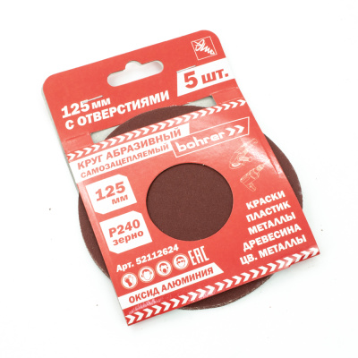 Круг Bohrer абразивный 125 мм Р240 под липучку (оксид алюминия) (с отверстиями) (Упаковка 5 шт)