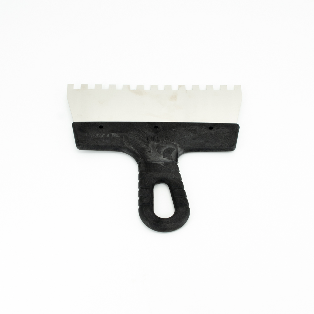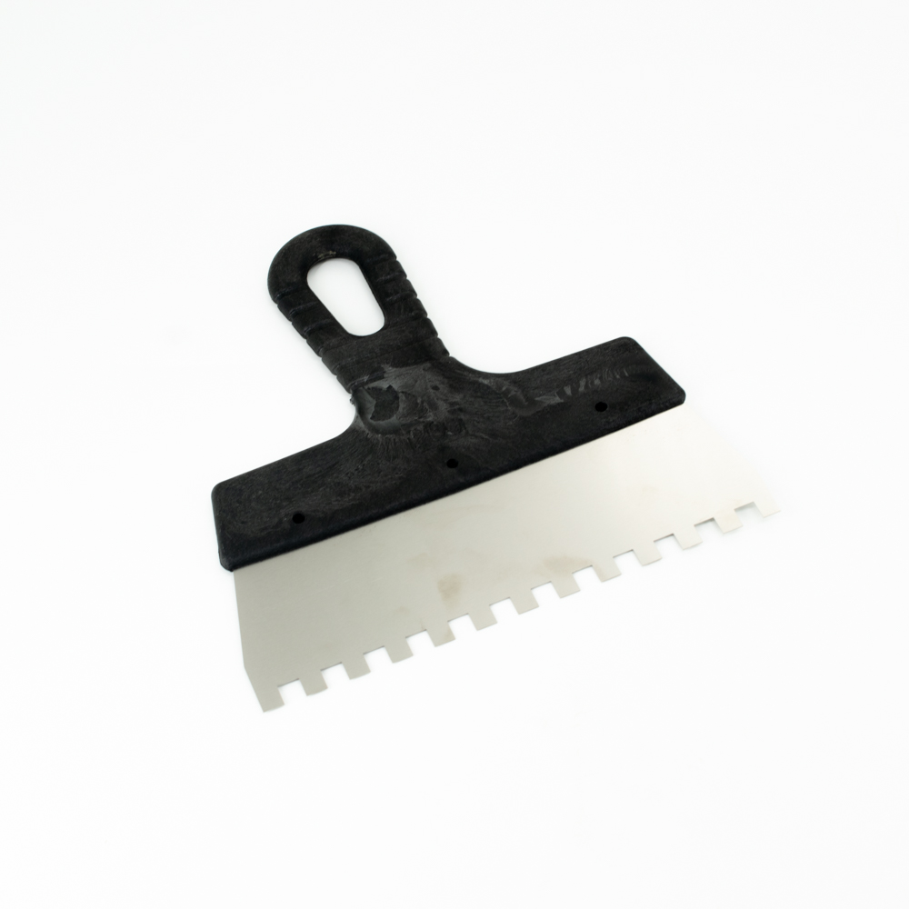 Зубчатый шпатель – это инструмент, используемый для установки плитки. Зубчатые шпатели применяются для разглаживания и расчесывания клея, который помогает крепить плитки к основанию