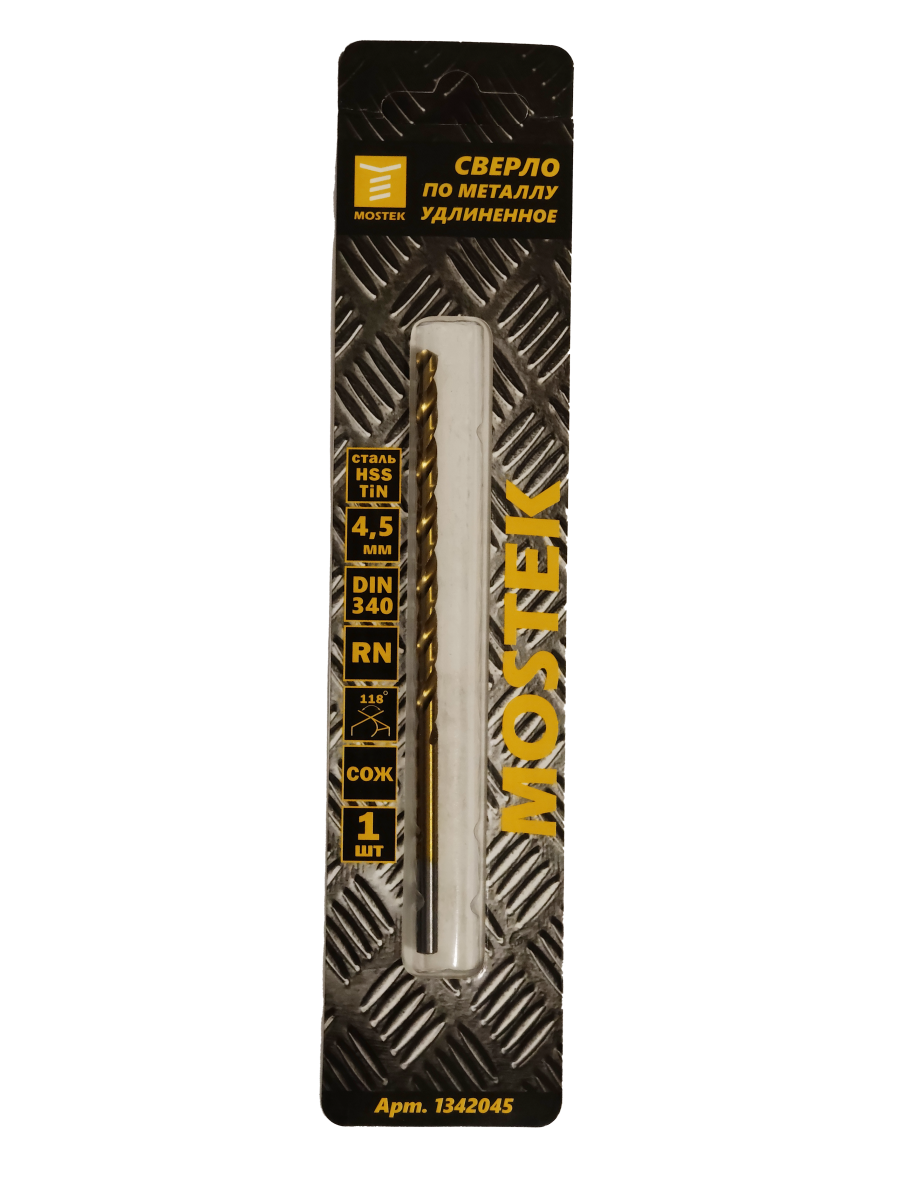Сверло по металлу MosTek  4,5х82/126 мм удлиненное HSS-TiN (титан - нитридное покрытие) DIN 340 RN (1 шт в блистере)