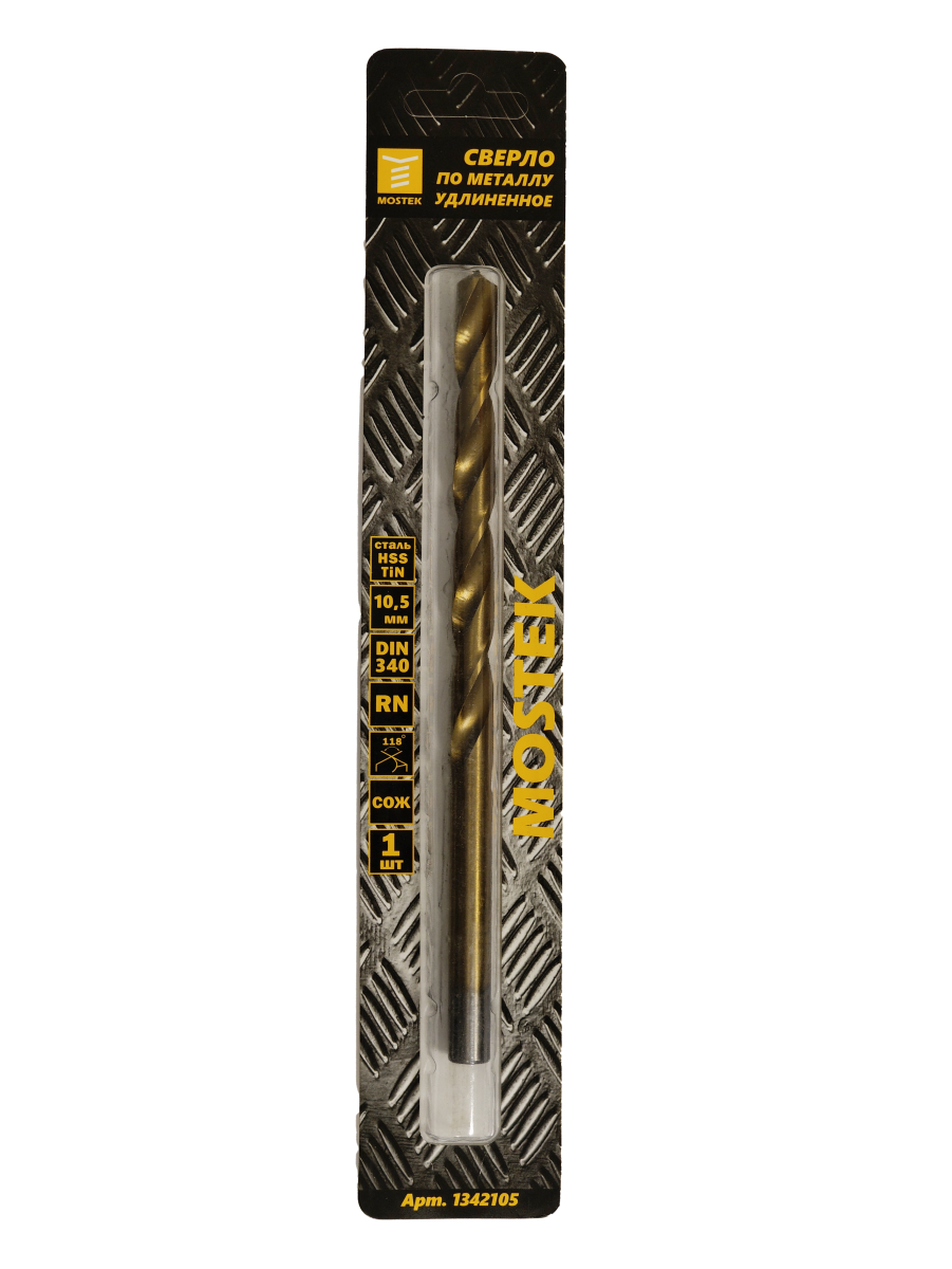 Сверло по металлу MosTek 10,5х121/184 мм удлиненное HSS-TiN (титан - нитридное покрытие) DIN 340 RN (1 шт в блистере)
