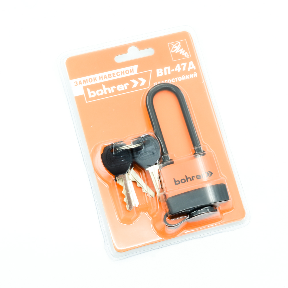 Замок навесной Bohrer ВП-47Д влагостойкий (удлиненная дужка) (дужка 6,5 мм, 6 ключей) (блистер)